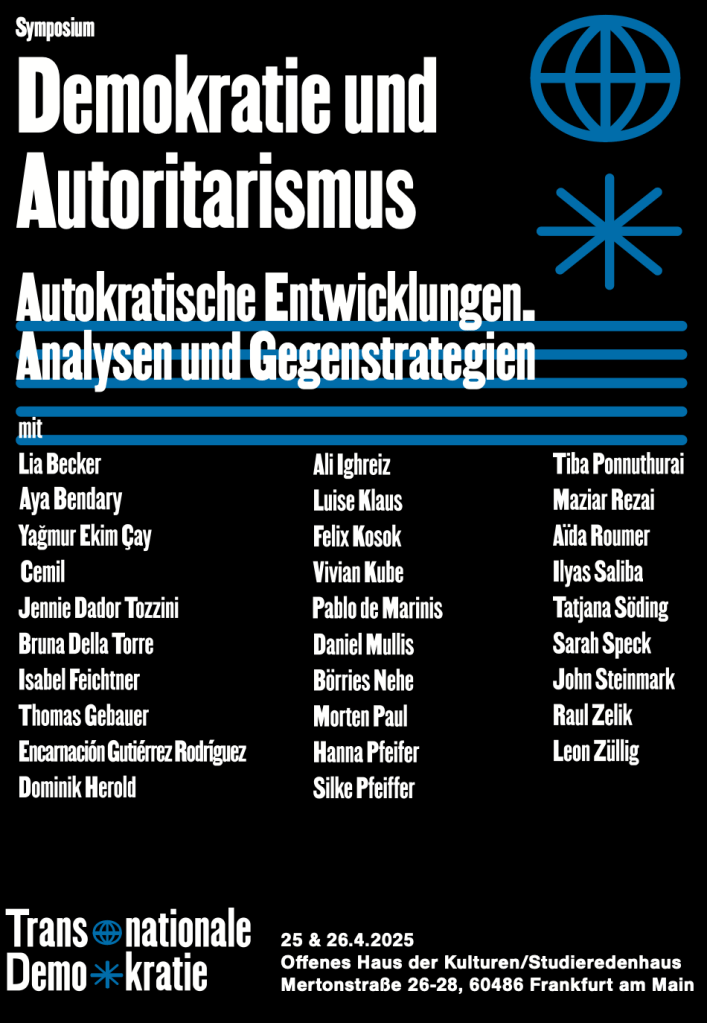 Autoritäre Kräfte sind weltweit auf dem Vormarsch. Ob als (Kultur)Kampf gegen progressive Werte (Stichwort: „Cancel Culture“ oder „Political Correctness“), als reaktionäre Politik gegenüber ökologischen Notwendigkeiten oder in Form wirtschaftspolitischer Programmatik, dieser neue Autoritarismus ist vielseitig und global vernetzt. Er schöpft aus alten Ressourcen und weist dennoch eine spezifische Eigenheit auf. Dieser Gegenwärtigkeit möchten wir uns auf dem Symposium widmen. So wichtig es ist, sich klar gegen rechtsextreme Pläne zu positionieren, so notwendig ist die Analyse der Treiber des Autoritarismus. Was macht Menschen anfällig für rechtsextreme Ideen? Warum verfangen die Politikangebote von Autokrat:innen? Welche Rolle spielen dabei die subjektiven Empfindungen der Menschen, welche die objektive soziale Lage? In den Räumen des Offenen Haus der Kulturen in der Mertonstraße 26-28 wurde sich an zwei Tagen den gegenwärtigen autoritären Verhältnissen gewidmet. Neben Podiumsdiskussionen und Vorträgen, die der Frage nachgingen, was das “Neue” an den aktuellen autoritären Bewegungen und Kräften ist, waren auch verschiedene thematische Workshops (Lateinamerika, Repression gegen Klimaaktivist:innen und die Bedrohung der Wissenschaftsfreiheit) Teil des Programms.