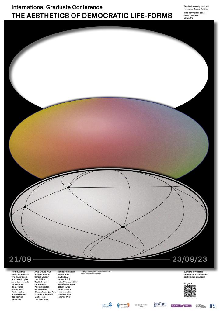 The international graduate conference The Aesthetics of Democratic Life-Forms thus seeks to understand aesthetics not as a disparate, hostile sphere in relation to democracy – an assumption which posits the aestheticization of politics to be inherently anti-democratic –, nor as a structurally analogous foil for democratic politics. Rather, this conference hopes to shed light on how aesthetic practices and phenomena provide insight into democratic life-forms, as well as how political practices and discussions implicate modes of conduct whose aesthetic dimensions lend themselves to productive analysis.