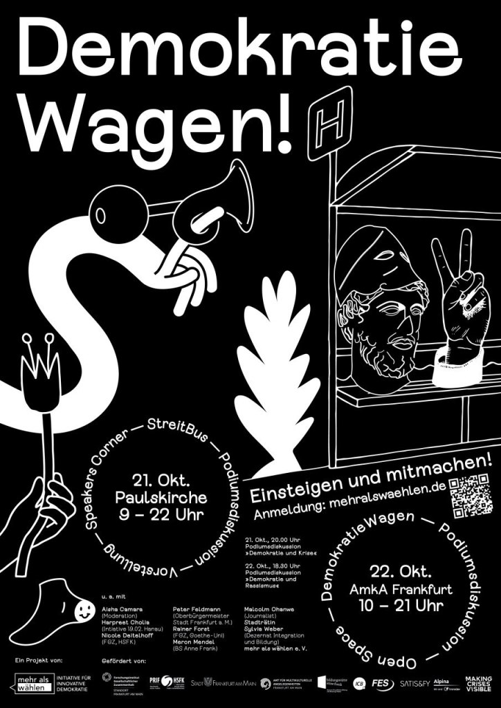 Vorgestellt wurde der Bus am 21.10.2021. Dazu fand am Abend in der Paulskirche ein Podiumsgespräch unter dem Titel „Demokratie und Krise?“ statt, das den Blick auf die Herausforderungen der Demokratie im 21. Jahrhundert richtete. Zwei Hauptfragen der Diskussion lauteten: Wie könnte eine Gesellschaft aussehen, in der Demokratie als grundsätzlich prozessual und veränderungsbedürftig verstanden wird: als unabgeschlossenes Projekt, das immer wieder erweitert und vertieft werden muss? Und wie kann eine solche Demokratie (besser) mit den vielfältigen, multiplen „Krisen“ umgehen, die aktuell zu beobachten sind? Dazu diskutierten nach einem Grußwort von Stadtrat Mike Josef (Dezernat Planen und Wohnen) und einer key note von Dominik Herold (mehr als wählen e.V.) Prof. Dr. Rainer Forst (FGZ, Goethe-Universität), Stadträtin Sylvia Weber (Dezernat Integration und Bildung), Mirrianne Mahn (Initiative Schwarze Menschen Deutschland) und Katharina Liesenberg (mehr als wählen e.V.).