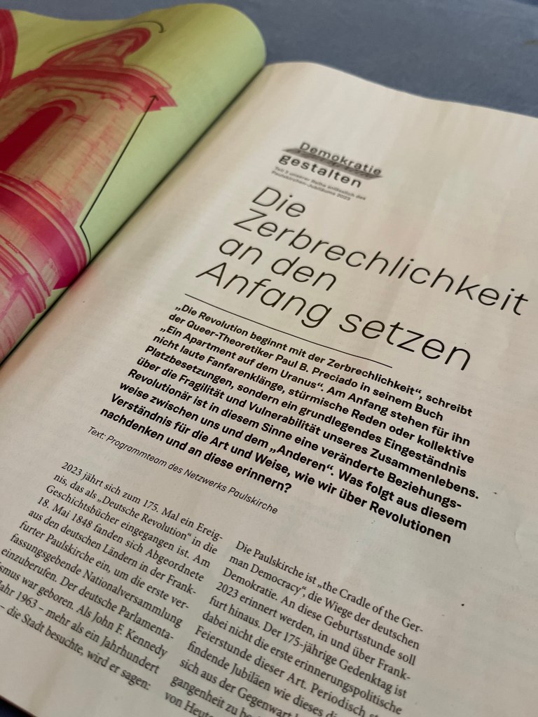 Anlässlich des 175-jährigen Jubiläums der Paulskirche haben wir uns zum Ziel gesetzt, die Entstehungsgeschichte der „deutschen Demokratie“ zu reflektieren und die Vorstellung einer Demokratie als Lebensform in den Fokus zu rücken. Entstanden ist das Netzwerk Paulskirche und die Frankfurter Tage der Demokratie mit verschiedensten demokratischen Projekten und Interventionen. Die Aktivitäten des Netzwerks erstreckten sich prozesshaft über zwei Jahre: von der ersten Veranstaltung im Herbst 2022 über das Jubiläumsdatum im Mai 2023 bis hin zur Etablierung und dauerhaften Fortführung bestimmter Formate im Jahr 2024.