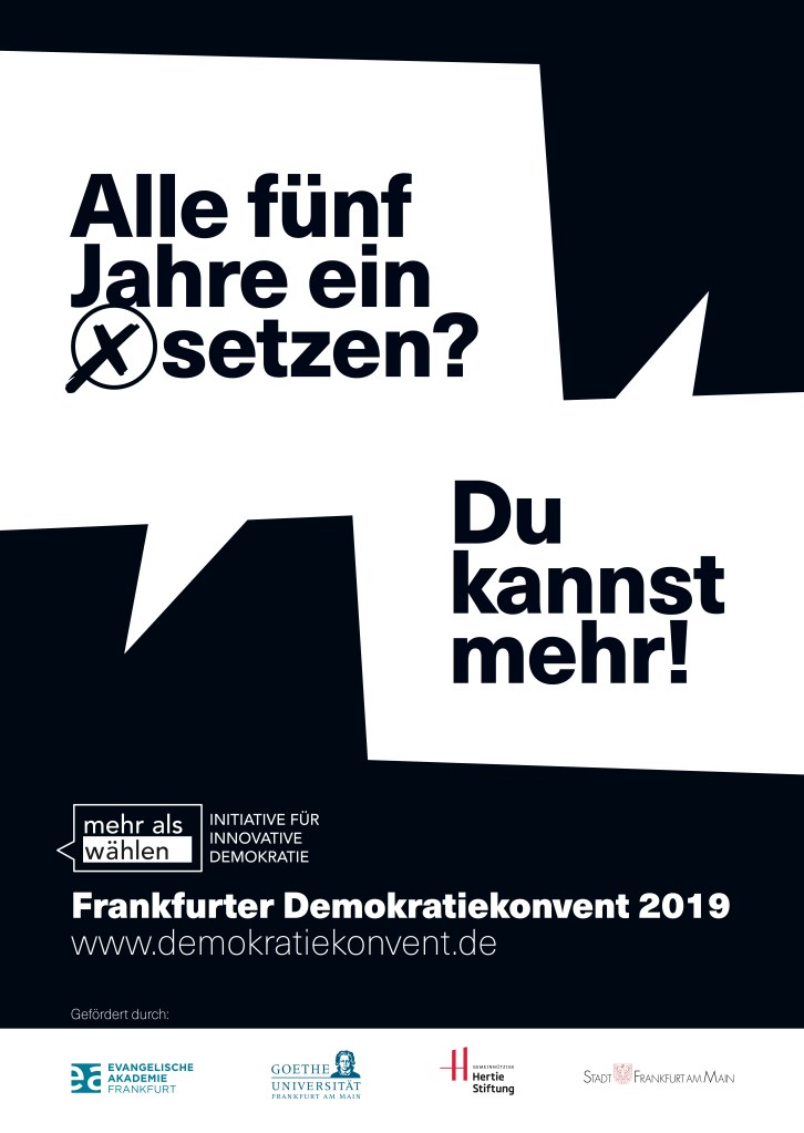 Der Demokratiekonvent ist ein zufällig ausgeloster Bürger*innenrat, den wir mit mehr als wählen e.V. erstmalig 2019 in Frankfurt am Main organisiert haben, um die kommunale Beteiligungsstrukturen zu verändern. Unser Ziel bestand darin, insbesondere marginalisierte bzw. unterrepräsentierte Gruppen mit in den politischen Gestaltungsprozess einzubeziehen. Von den 60 Teilnehmenden wurden deswegen 2/3 zufällig ausgelost und 1/3 durch aufsuchende Beteiligung angesprochen. Unser Name war dabei Programm, insofern wir Demokratie als eine Lebensform verstanden haben, die mehr ist als nur zu wählen. Demokratie so unsere Überzeugung zieht sich durch alle Lebensbereiche, sie formt ihre Subjekte unentwegt. Mit dem Demokratiekonvent wollten wir Menschen für Politik begeistern und Zugänge zur Politik schaffen. Dafür setzen wir auf Austausch und konstruktiven Streit zwischen Bürger:innen, aber auch zwischen Politik und Zivilgesellschaft.